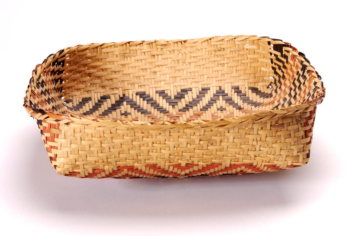 DescriptionSplit cane twilled basket, shallow with a roughly square mouth and rounded bottom, woven with three colors of cane in different diamond pattern or zig-zag designs.