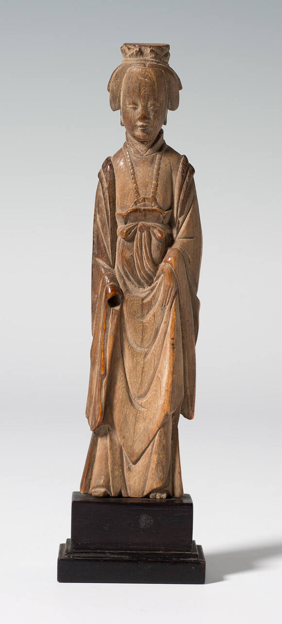 DescriptionStanding figure in long robes, arms down at sides, (right hand missing), sash around waist with bow tied in front. Simple crown on head.