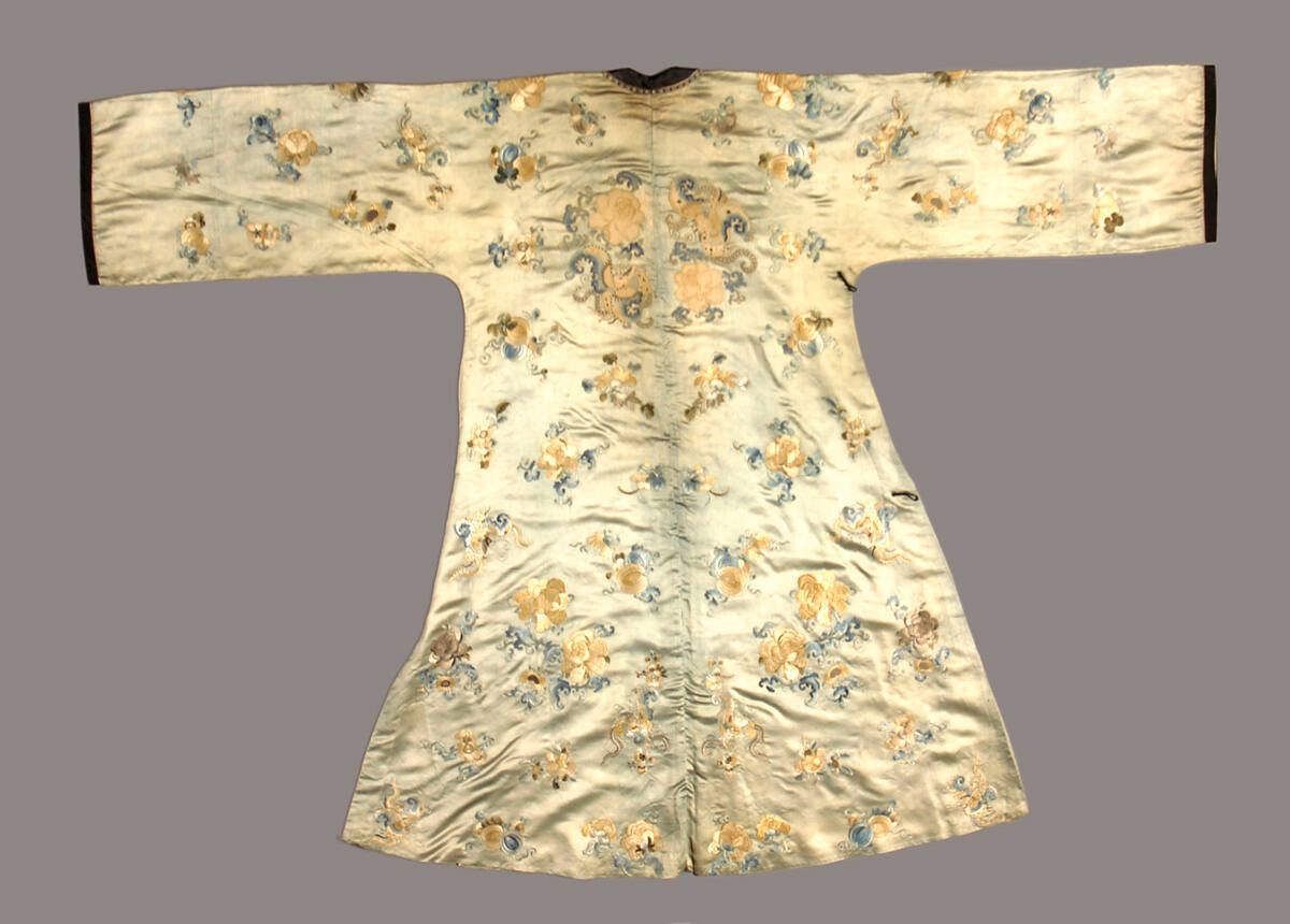 DescriptionLight blue satin coat embroidered with scattered flowers and melons. Front and back have flowers and butterflies in Peking stitch.