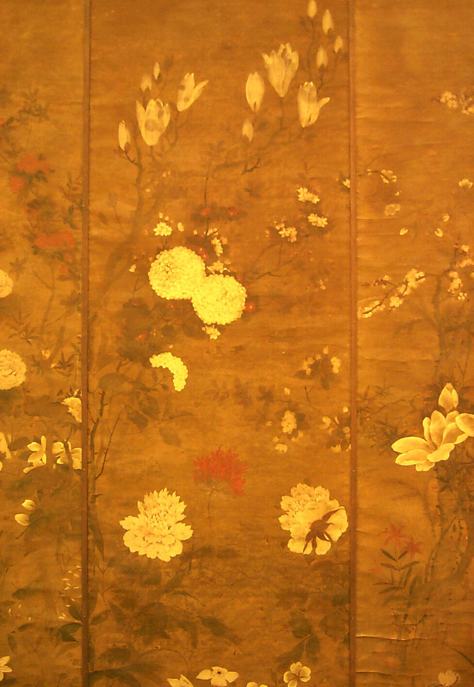 DescriptionDouble chrysanthemums and white magnolia. One of a set of twelve hanging scrolls representing flowers of all seasons.