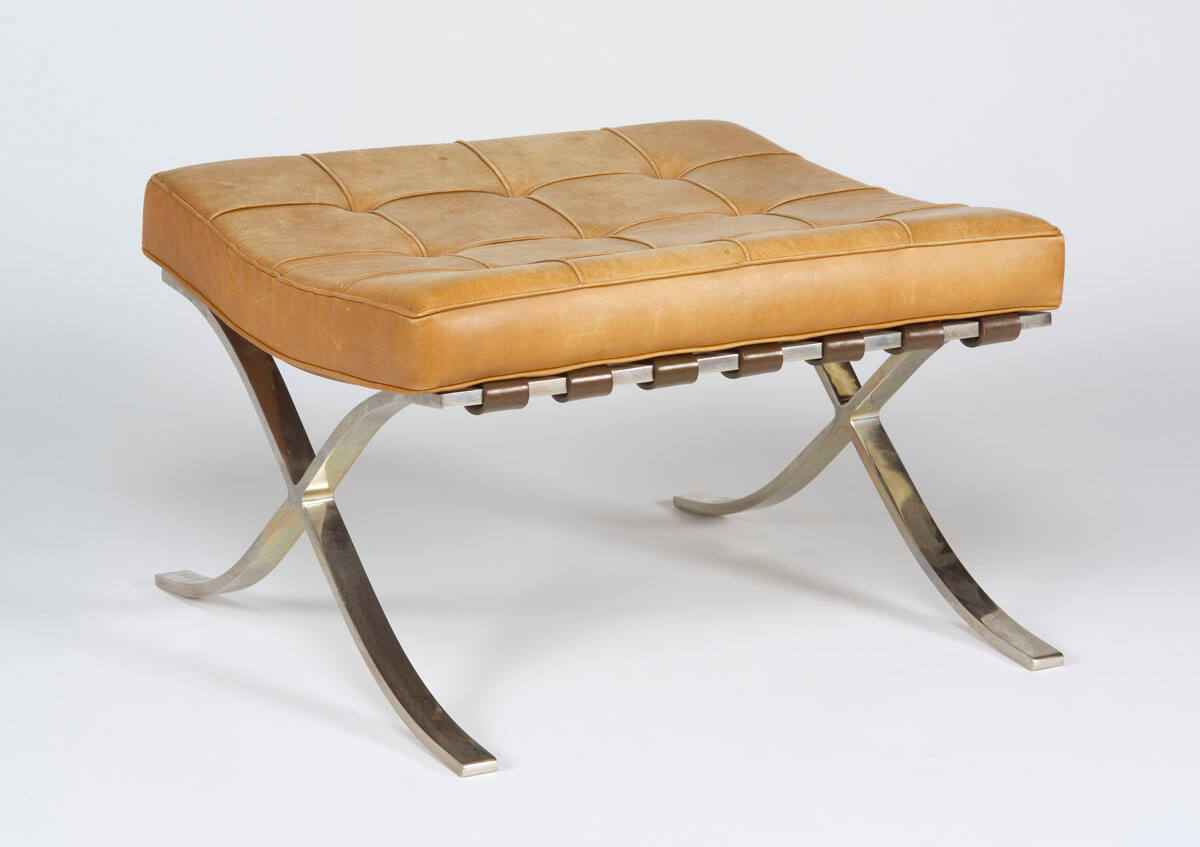 DescriptionStool with chromed metal frame with seven horizontal strips between front and back bars: 16 rectangles on cushions. Leather faded to tan.CopyrightThis work is copyrighted. Contact the copyright holder for permission to reproduce.