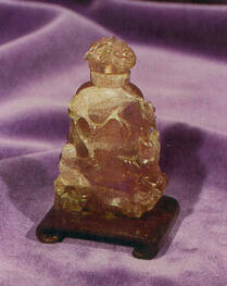 DescriptionFlattened spade-shaped pink bottle carved in high relief with four boys standing ona rock on each of four corners, holding a branch of flowers, carved flower matching stopper.