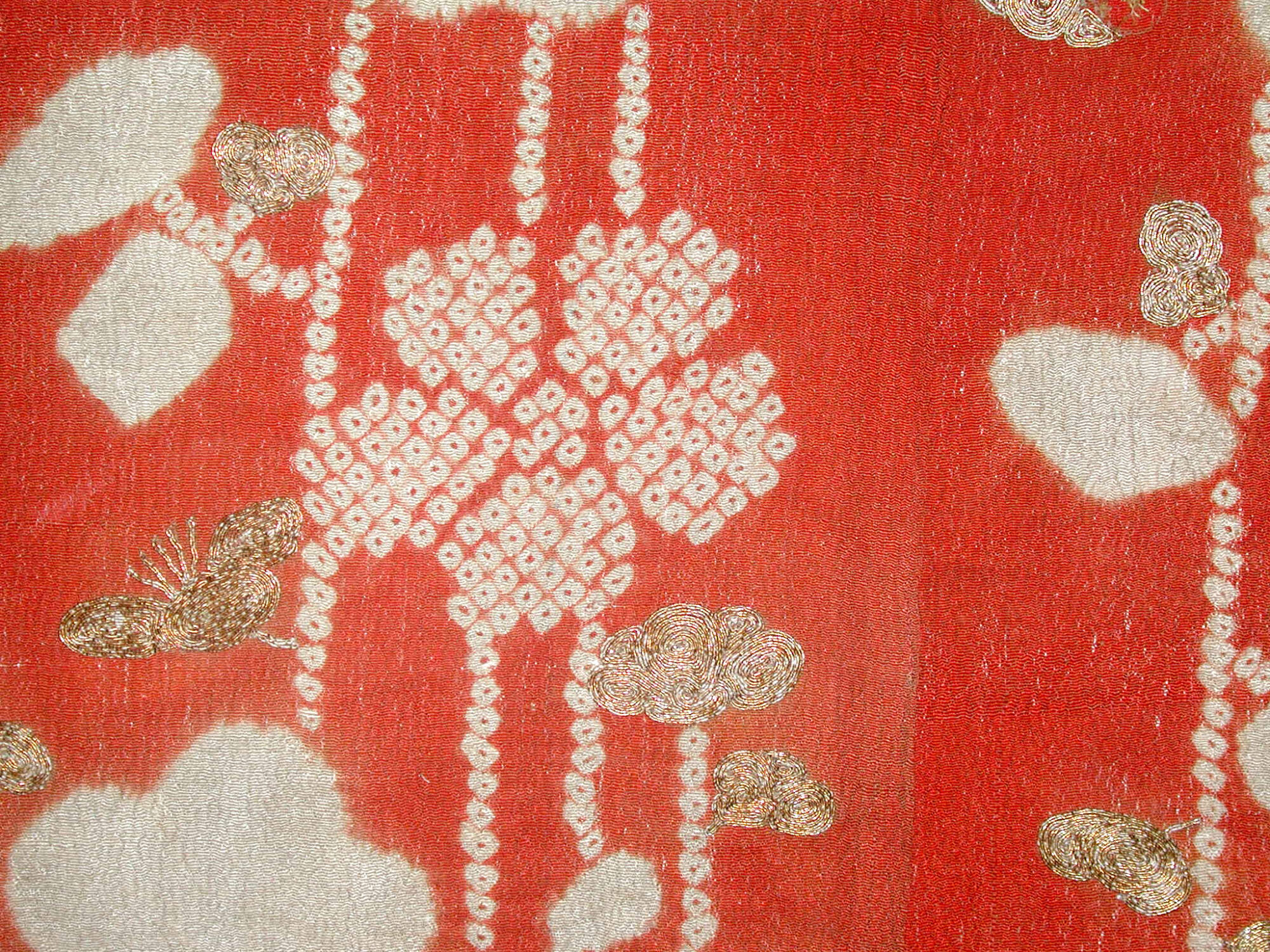 MediumRed silk crepe ground with tie-dyeing (shibori) and gold thread embroidery