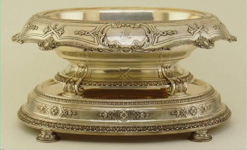 DescriptionThe center bowls is marked Gorham Sterling, MGW, with 3 seals. It has a gold-washed interior and is mounted on four oval-shaped pad feet. It is monogrammed MEL, is round in form with deep everted rim chased and applied with beading and scalloped edge surrounded by shell cartouche. The liner bowl has 2 drop ring handles applied with inside brackets. Marked GM Co. EPUGW. The silver mesh insert fits inside the rim of the insert bowl having a domed form. The plateau is oval in form, having four, round-pad feet. En suite with the bowl and marked VFT. Tray is marked sterling NMC with 3 seals. It has a plain central well chased at the corners with large-scale shell and scroll motif. Monogrammed MEL.