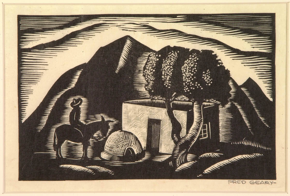 Gallery LabelFred Geary, a Missouri native, possessed a talent for translating the spirit of a place into a graphic image. Beginning in the late 1920s, he traveled throughout the Southwest. These excursions provided subjects for his woodcuts, like this untitled print. It is similar in size to a postcard. Like a postcard, the woodcut describes imagery popularly associated with the Southwest, including a man wearing a sombrero and riding a burro.