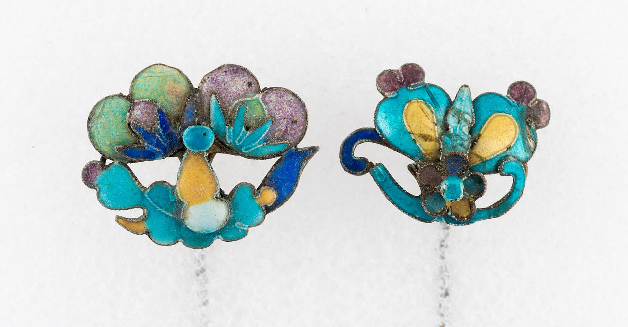 DescriptionOne of a pair of hair ornaments decorated with fruit and leaves in enamel.