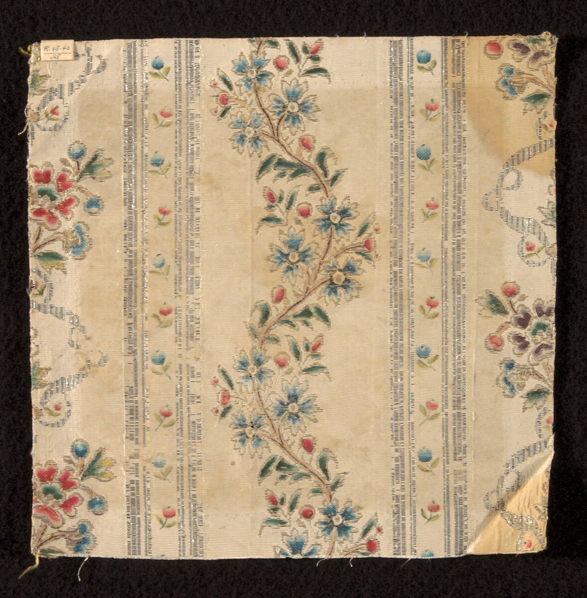 DescriptionCream striped silk with supplementary weft of siler strip in the narrow stripes. Brocaded with silver strip and with painted polychrome flowers.