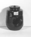 DescriptionA tea caddy of dark brown clay with a greyish brown underglaze and a cloud of darker brown on the upper half. With a lid.