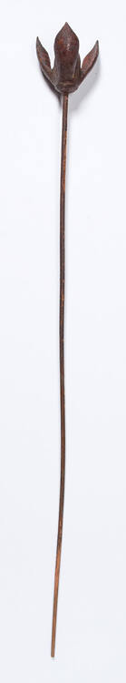 DescriptionThree-petal flower on a straight stem, carved out of wood in a red-brown color.