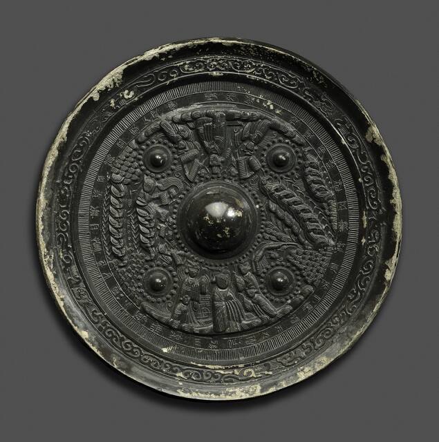 The images on this mirror refer to the cult of Kunlun-the axis of the universe and a mountain where all immortals dwelled. A goddess known as the Queen Mother of the West was the Kunlun ruler, who conferred immortality on her believers and registered their souls in her paradise. Here, she poses with her four attendants on the lower part of the mirror. King Father of the East, her male counterpart, can be seen with four attendants on the upper part. Between them are two large columns of winged horses emerging from the mountain formations, galloping around the motionless universal axis, the central knot of the mirror. These pictorial motifs are enclosed by a band of inscription: