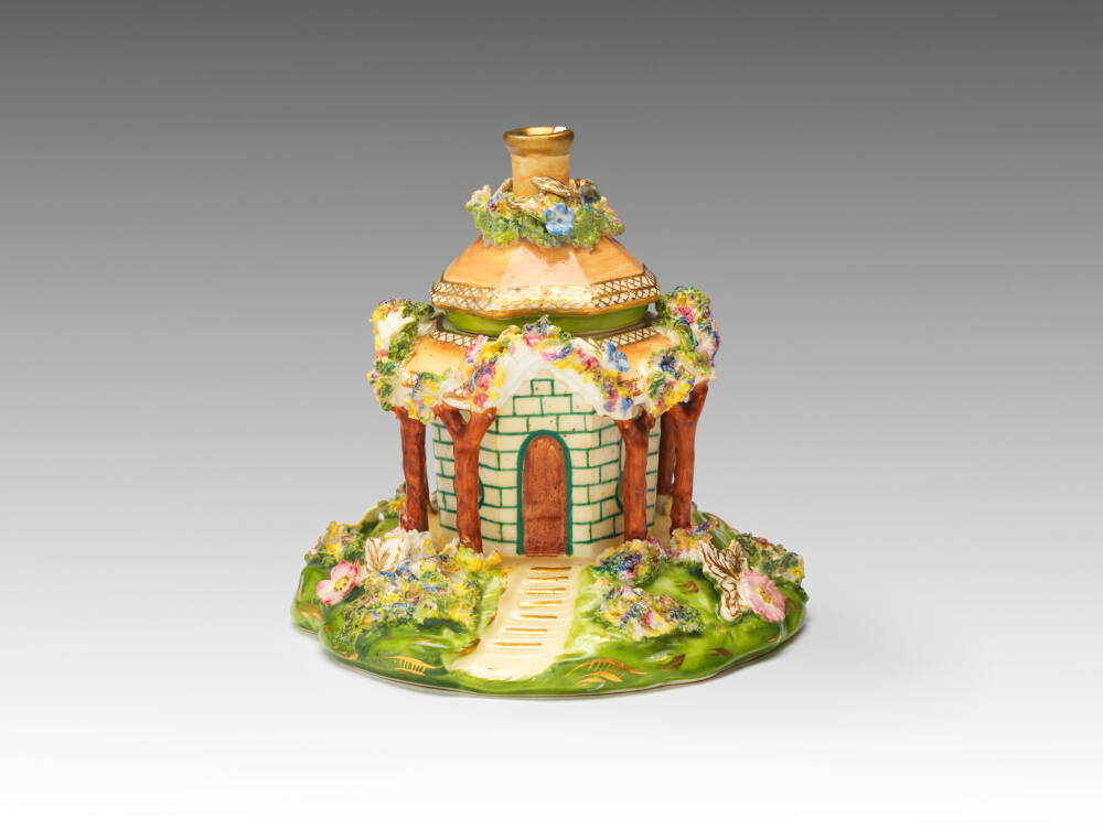 DescriptionOctagonal shape with rustic lower roof supports. Roof in salmon-color with gilt and multicolor vines and flowers. Bricks outlined in green on cream. Sloping terrace at base. Green with gilt and multicolor flowers. Octagonal removable cupola with round chimney surrounded by multicolor flowers.Exhibition HistoryCastles, Cottages, and Crime, The Nelson-Atkins Museum of Art, Kansas City, Missouri, July 10 2021–March 06 2022, no cat.