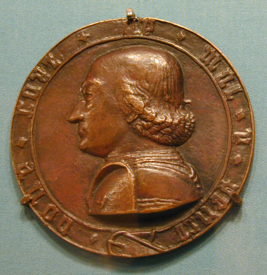 DescriptionObverse: l. profile portrait of hooknosed man facing l.: front of head bald, long hair, rear, with fillet. Inscribed in clasped belt on perphery in Gothic letters: "Honi Soit Qui Mal y Pense". Reverse: group of five putti supporting double cornucopia with an eagle arising from center. Letters "FE" at l. margin, "DUX"" at r. Dark brown patina.