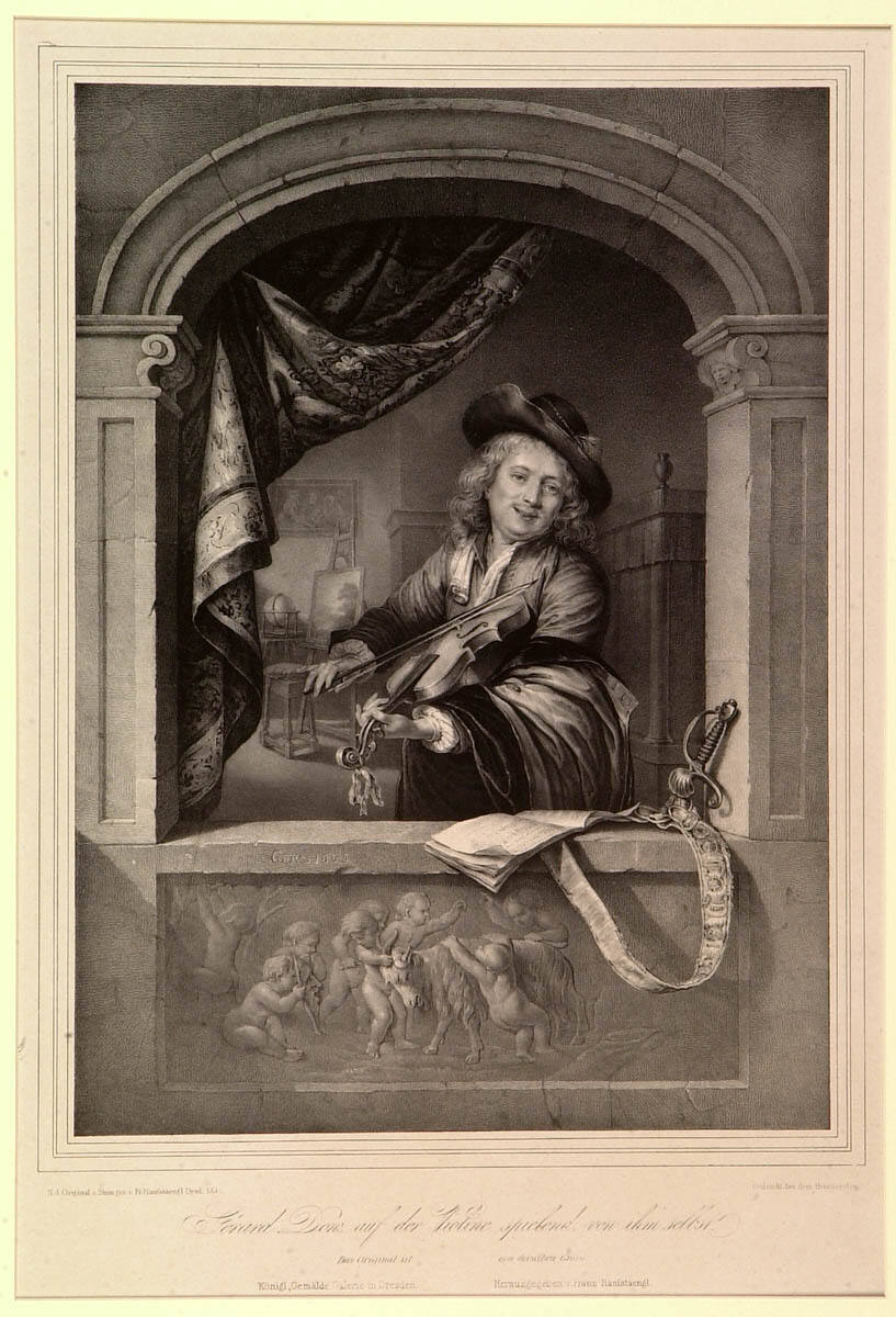 Purchased from Alden Galleries by The Nelson-Atkins Museum of Art, 1933.Die Vorzüglichsten Gemälde Der Königlichen Galerie In Dresden nach Den Originalen Auf Stein Gezeichnet. Nebst Erklärungen In Historischer Und Artistischer Hinsicht In Deutscher Und Französischer Sprache Von G.J.A. Frenzel, Vorsteher Der Königl. Galerie Der Kupferstiche und Handzeichnungen Zu Dresden, Ehrenmitglied Der Kaiserl. Academie Der Künste Zu St. Petersburg Herausgegeben Von Franz Hanfstaengl. / Les Principaux Tableaux De La Galerie Royale De Dresde Lithographiés D’Après Les Originaux. Avec Des Explications Historiques Et Concernant L’Art, En Allemand Et En Français Par J.G.A. Frenzel, Conservateur Du Cabinet D’Estampes De S.M. Le Roi De Saxe, Membre Honoraire De L’Académie Impériale Des Beaux Arts De St. Petersburg. Publies Par François Hanfstaengl (Dresden, 1836–1843). George L. McKenna, Prints, 1460–1995 (Kansas City, MO: Nelson-Atkins Museum of Art, 1996), 302, as after Gerrit Dou, Gerrit