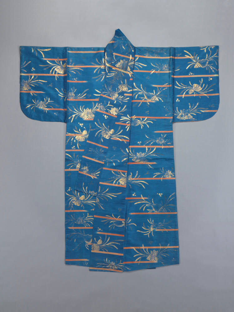 DescriptionBlue ground silk with ikat (kasuri) weave and gold leaf. No robe (Surihaku type) with seaweed and shell (mirugai) pattern.Exhibition HistoryMasterpieces of Japanese Art, Dallas Museum, Dallas, TX, Oct.4-Nov.30, 1969, no. 50.