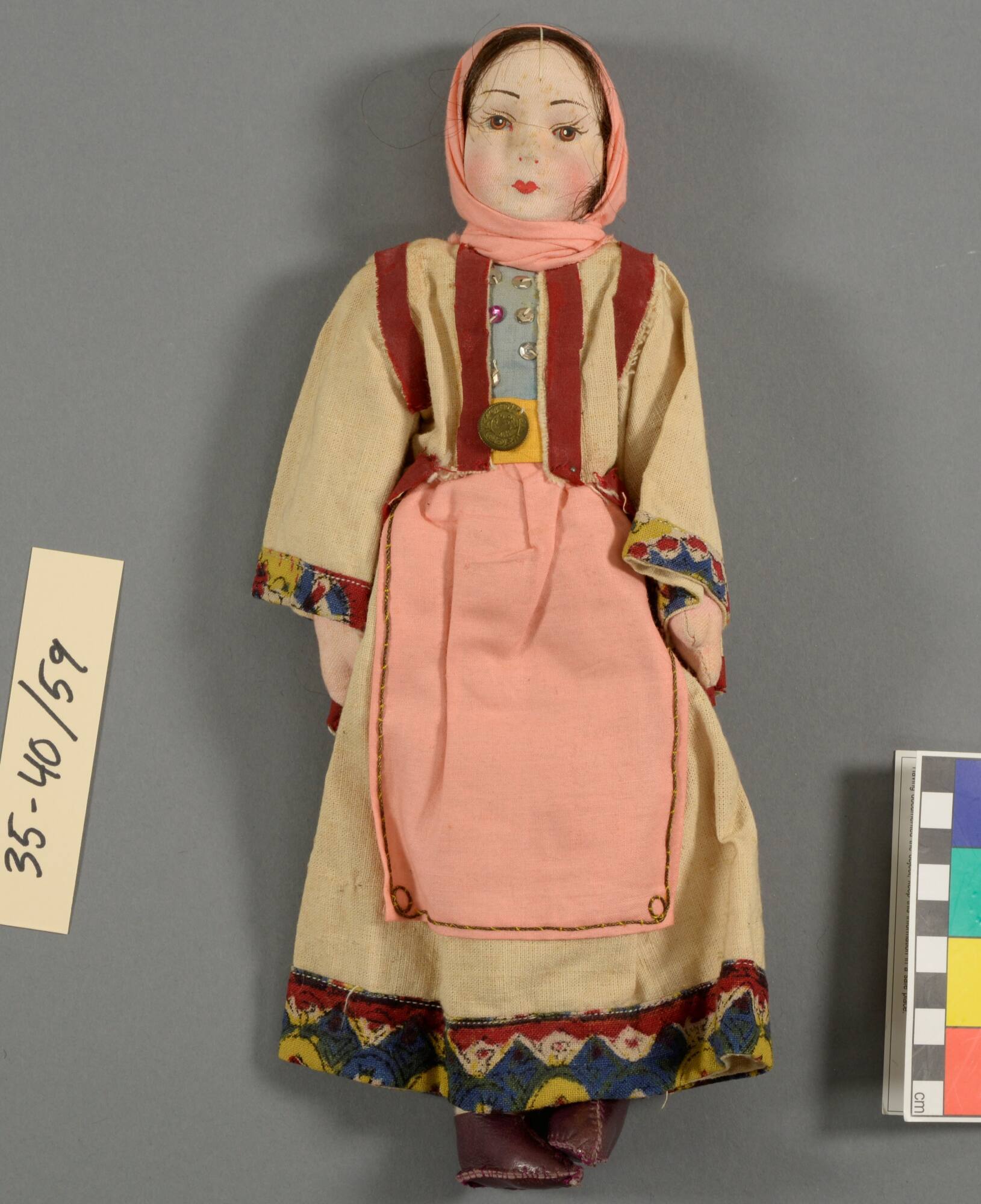 DescriptionPeasant woman in white dress and coat bordered in red, blue blouse, yellow sash, pink apron and pink shawl on head, red leather shoes.ProvenancePearle Scales Moore (1867-1934), Peoria, IL, by 1934 [1];
