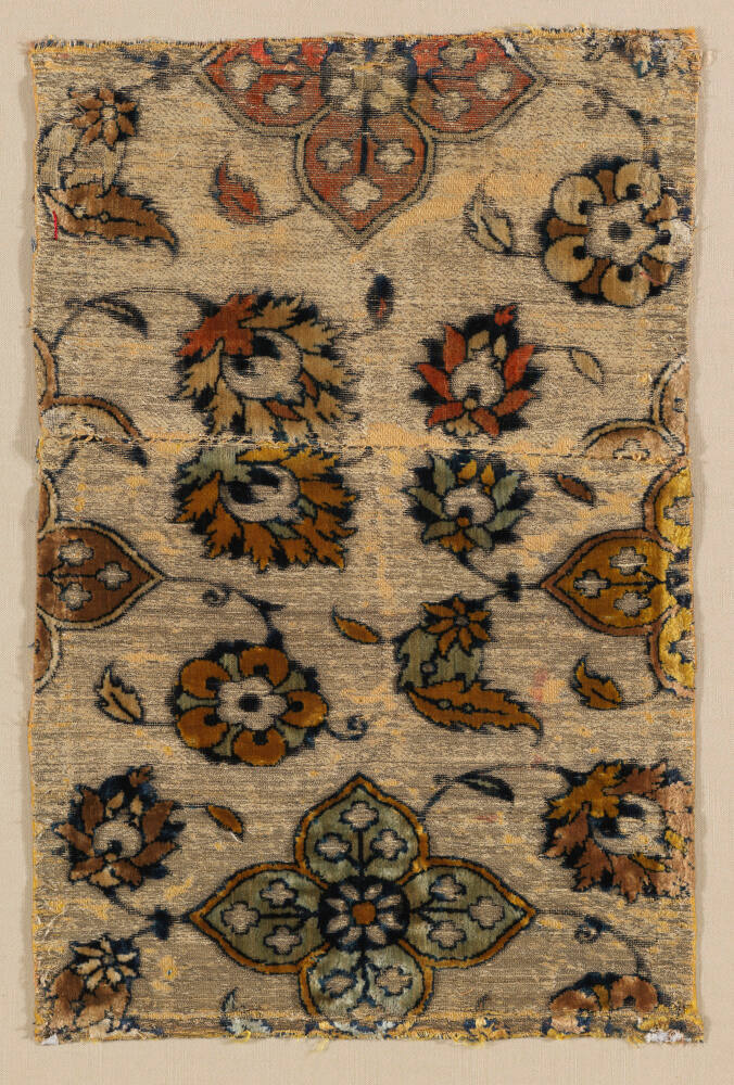 Silk velvets and brocades produced during Persia's Safavid Dynasty (1501-1722) were among the most luxurious and expensive textiles of their time. In 1598, Shah Abbas I (r. 1588-1629) conquered the silk-producing provinces on the Caspian Sea, bringing the Iranian silk industries there completely under Persian control. Manufacture of high-quality textiles intended for both local and export markets flourished. Velvets, such as this example, were made by adding supplemental silk warp threads to the weave. These additional threads were pulled up from the weave and cut to create a raised pile surface.