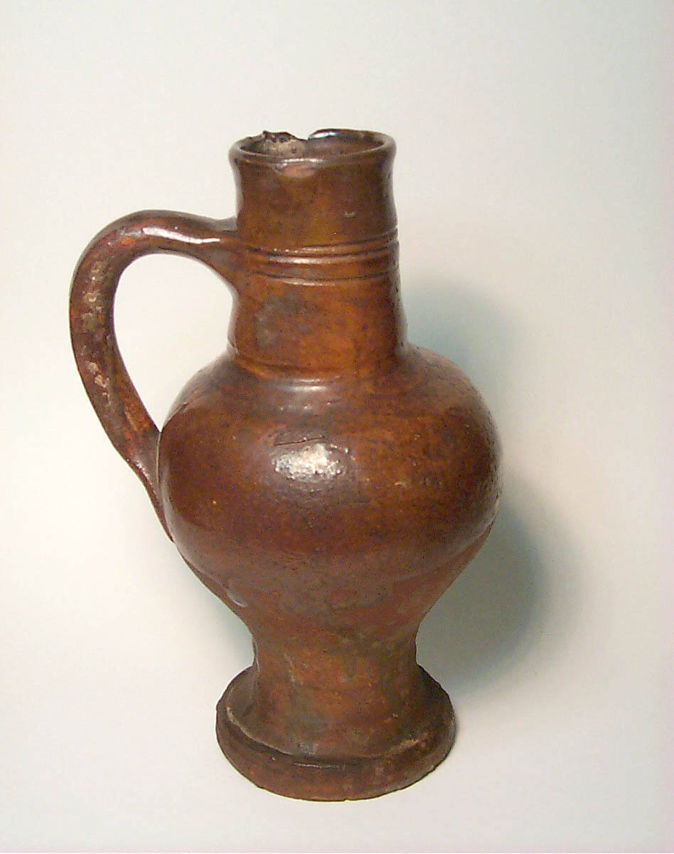 DescriptionHeavy, looped handle joining tall, cylindrical neck at point where it is encircled by three annular ridges. Irregular dark brown glaze which does not extend to the base.