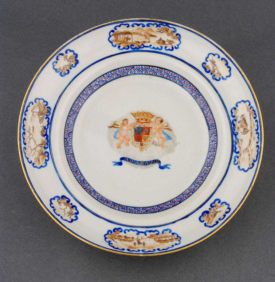 DescriptionPlate with arms of Araujo de Acevedo. Borders of small panels enclosing Chinese style landscape scenes; birds, and animals in sepia within blue outline.