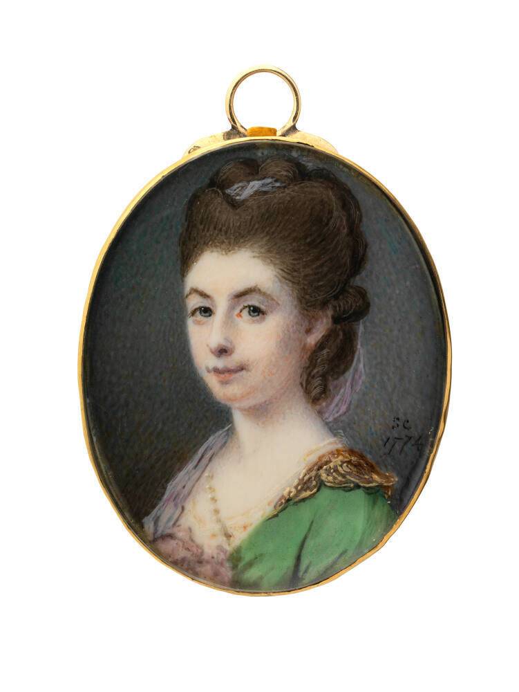 DescriptionPortrait miniature of a woman with natural hair wearing a green gown before a gray-brown background.Exhibition History