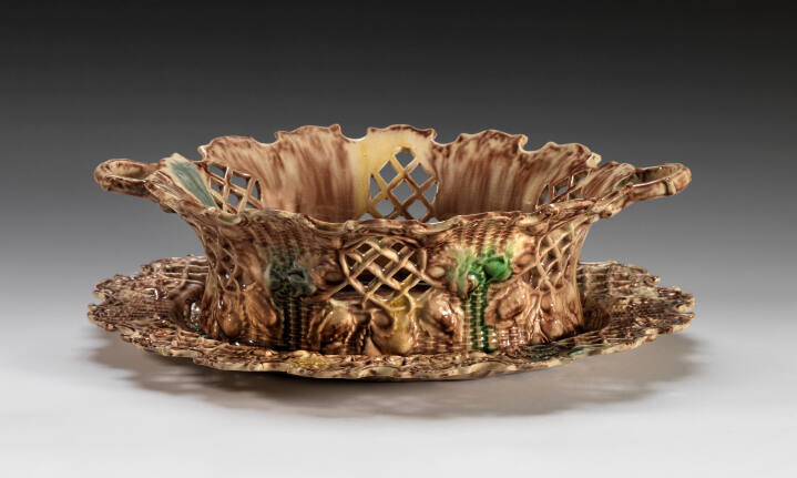 DescriptionBuff molded body, 'tortoiseshell' glaze with brown, greens, and yellow oxidesGallery LabelThis basket would have been used to serve cake or fruit.