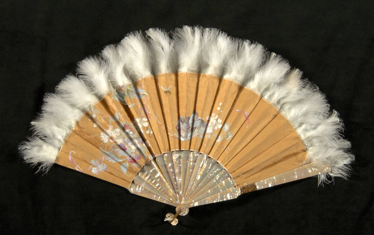 DescriptionFan of tan silk with painted desgin of bird's nest on flowering branch and three small birds. Mounted on mother-of-pearl. Upper edge of fan edged with white feather tips. Small gold rectangle on edge of handle with initials A.I.G.ProvenanceVirginia Eaton George (1889-1975), Kansas City, MO, by 1938;