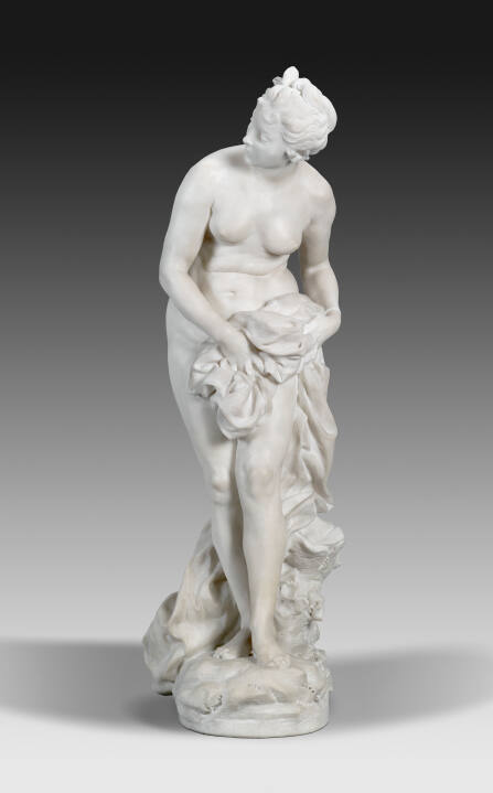 For Standing Bather, Jules Dalou took inspiration from antique sculptures of the Venus Pudica, or “modest Venus,” in which the goddess attempts to cover her naked body with her hands and drapery. While the subject and Dalou’s idealized treatment of the body continue classical traditions, the figure’s softly curled hair, delicate facial features, and cascading drapery reflect the influence of French Rococo models of the 1700s.