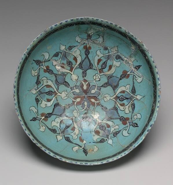 The decoration of this vessel demonstrates the pervasiveness of early Islamic designs in the eastern Islamic lands. The inside of the bowl is painted with interlocking palmettes and split-leaf arabesques that create a repeating hexagonal pattern radiating from the center. Turquoise glaze is frequently used in Islamic art at this time in the production of ceramic wares and glazed architectural tiles.