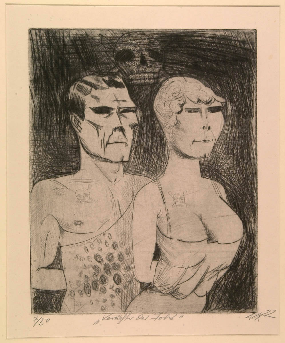 Gallery LabelOtto Dix is best known for his bitter critiques of modern life—its moral failures, dehumanizing forces and propensity for violence. In this roughly drawn drypoint print, he depicts two circus performers in three-quarter view. Their chiseled faces, hardened eyes, expressionless mouths and sculpted physiques attest to their skill and determination as performers of death-defying feats. Together, but ultimately alone, they risk their lives daily for the thrills of an unknown audience. A skull looms in the darkness between them.