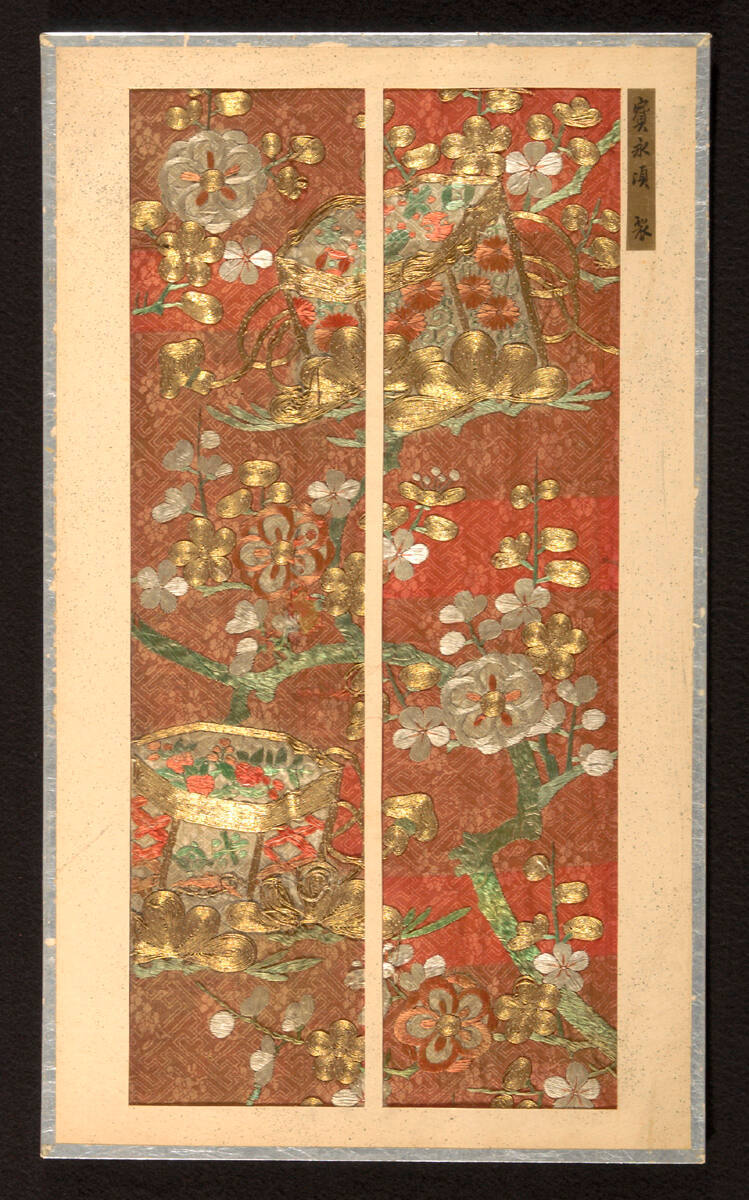 Fragment from kosode with design of standing plum tree (tachiki moyo) and shell game (kayoke) boxes