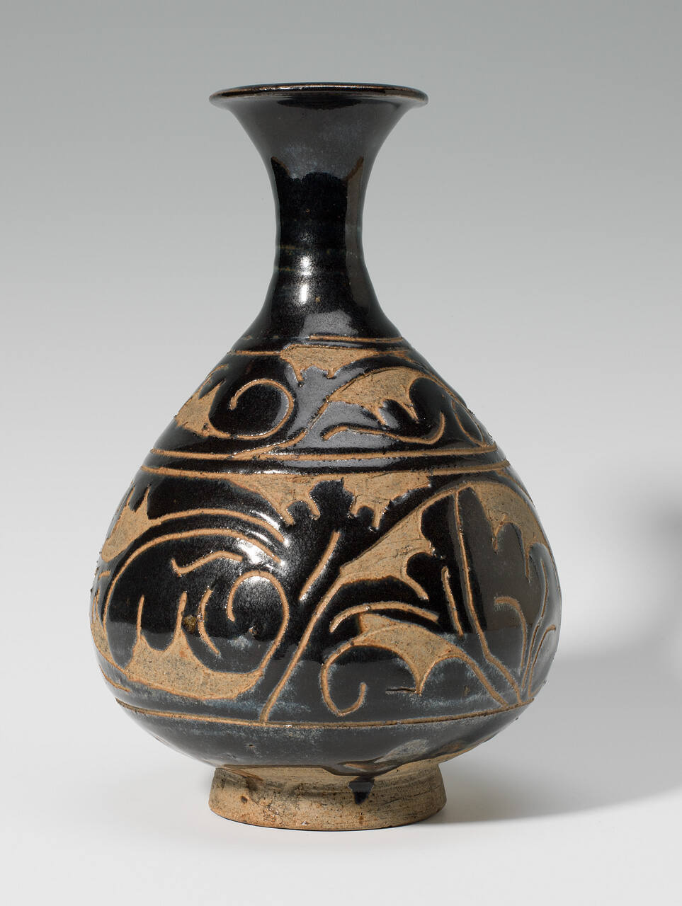 DescriptionFlask shaped vase with narrow neck and flaring at lip. Heavy brown glaze cut in two registers with floral ornament exposing the body.