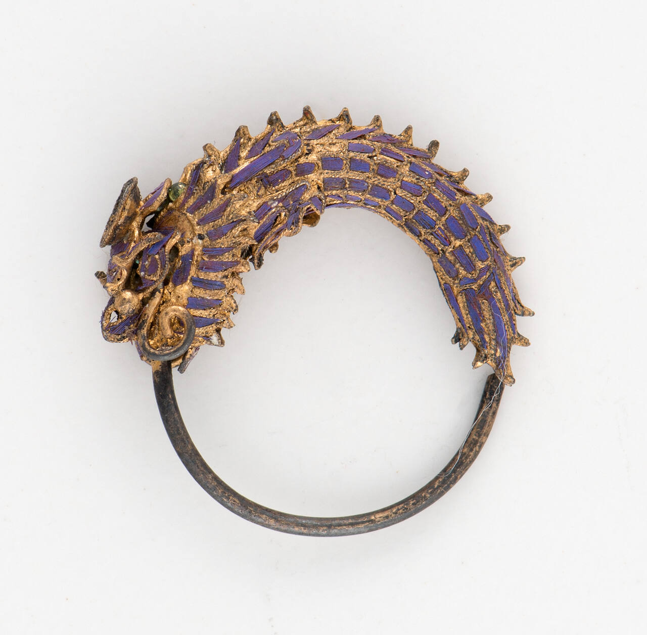 DescriptionRound gold earring with feathers half way around in form of dragon, painted purple and gold.ProvenanceElla Anna Loose (née Clark, 1860-1945), Kansas City, MO, and Washington, DC, by 1934 [1];