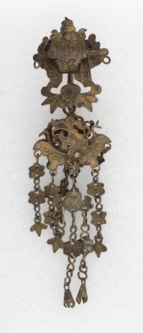 DescriptionPetal shaped earring with seven tiny chain pendants.