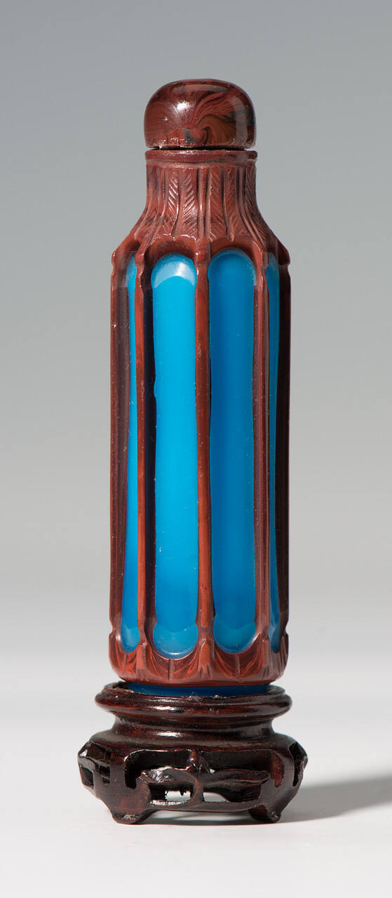 DescriptionOf tall cylindrical shape, in the form of a cricket cage, the bright blue metal overlaid with lacquer-red and carved into vertical struts.