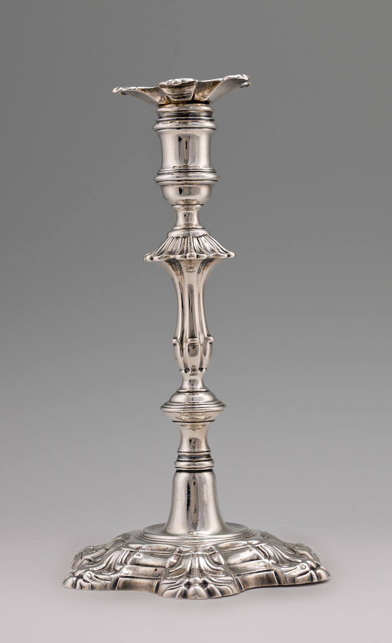 DescriptionBaluster candlestick with bobeche; circular stepped base with six shells/ leaves separated by inward curving steps; collar above foot with flattened knop above, foliate form above with six- leaf collar above; plain socketProvenanceMr. Perry (1902-1993) and Mrs. Charlotte Faeth (1907-2001), Kansas City, MO, by 1996;