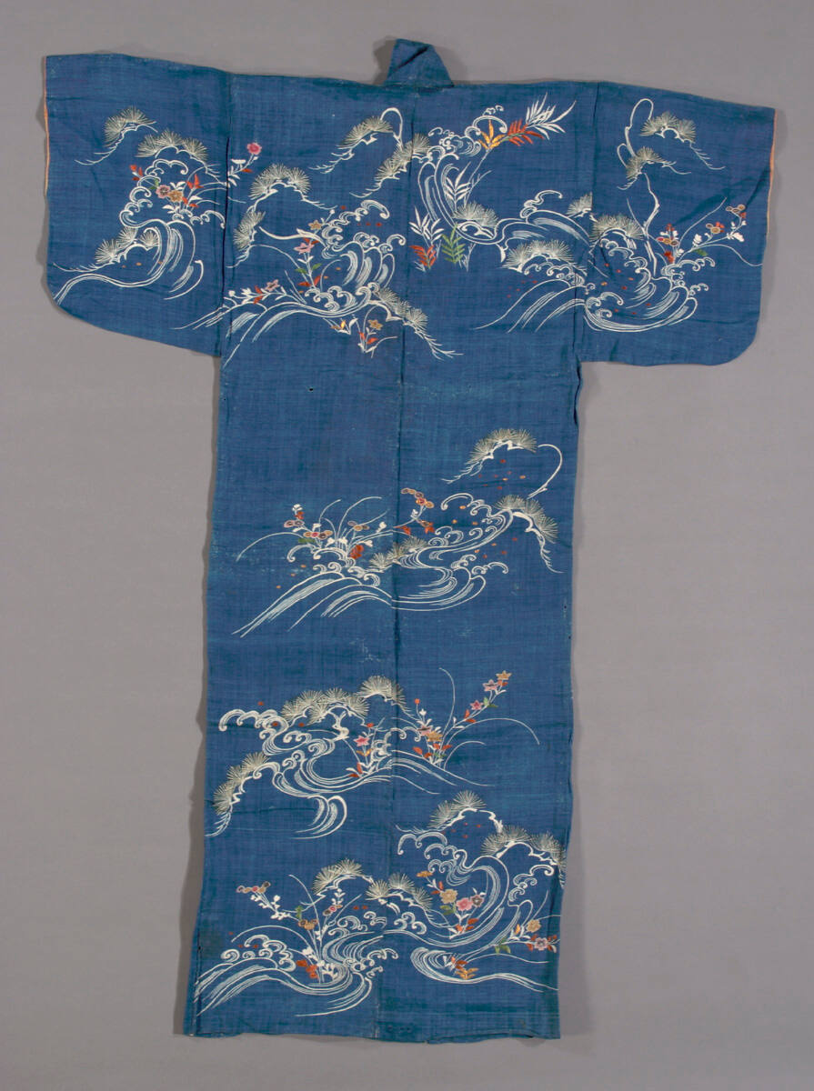 DescriptionBlue ground bast fiber with yuzen dyeing, shiro age (color rubbing), silk and metallic thread embroidery. Design of pine and water, cherry, chrysanthemum, and bamboo.