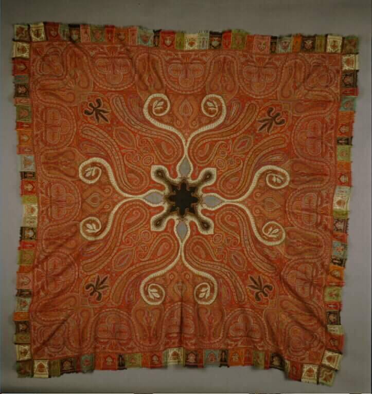DescriptionTwill tapestry made of many small pieces sewn together, including many curving pieces that represent details of the pattern.  The field, 45 inches square, depicts an eight-petalled flower with long tendrils radiating outwards on each side, interspersed with botehs.  Botehs and flowers alternate under a scrolling vine in the borders.  The outer border is a series of small individually embroidered patches that have been sewn together.  Has export number.  Pieced together.Exhibition HistoryJohn Donnelly (1932–2020), Kansas City, MO, by 1990;