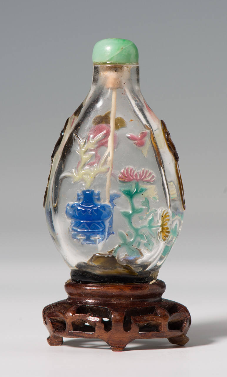 DescriptionOf rectangular section, the grayish-white stone carved in low relief on the front with six stylized shou characters, the reverse with six stylized fu characters, the sides with mask-and-ring handles.