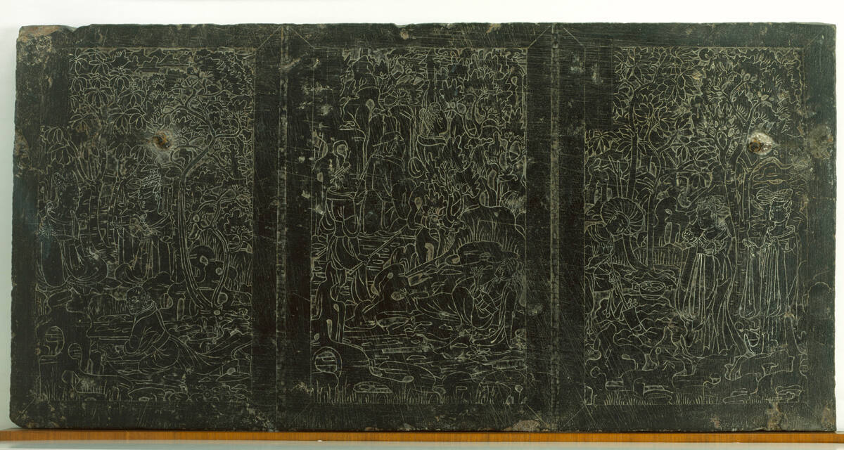DescriptionEach stone engraved with three scenes of filial piety on one side and three sections with two demons on each in reverse.Gallery Label