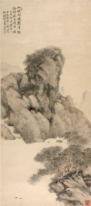 In this mountain scene, the crisp contour of boulders contrasts against a chilly river. Distant peaks, drawn in pale ink, are visible in the background. Below, two orioles’ birdsong echoes throughout the still river valley. In some Chinese paintings, the season is unclear. The artist notes in the inscription that he made this work in the wintertime, and the atmosphere might appear wintry. However, the poem and foliage suggest that it may be springtime. Take another look—what season do you think it may be?