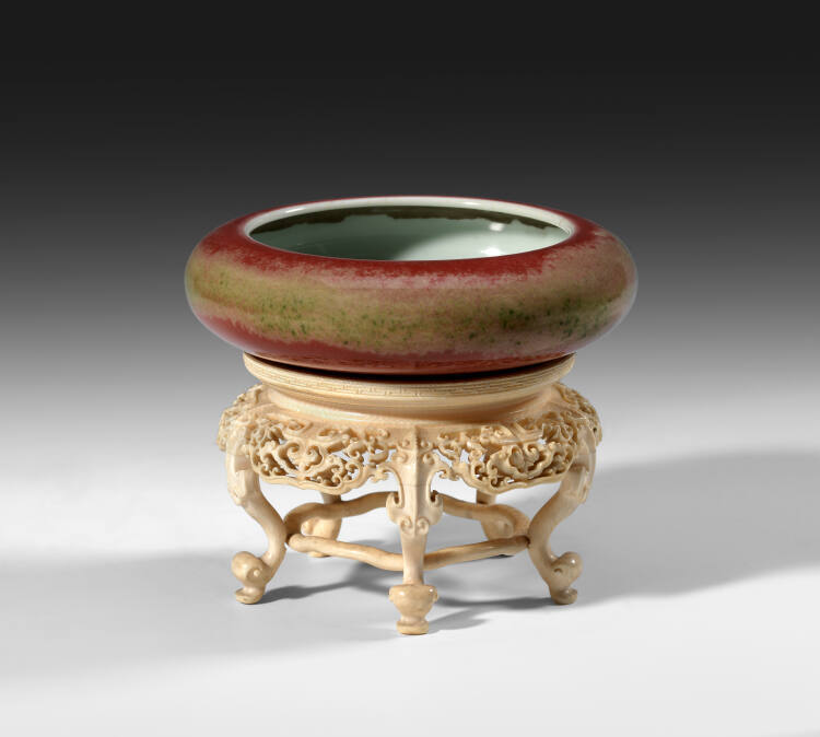 DescriptionImperial porcelain peach-bloom coupe; circular in form with a squat, ovoid body and a wide mouth; the exterior is coated with a peach-bloom glaze, reddish at top and bottom, greenish in the middle. With an ivory stand.ProvenanceYamanaka & Co.;