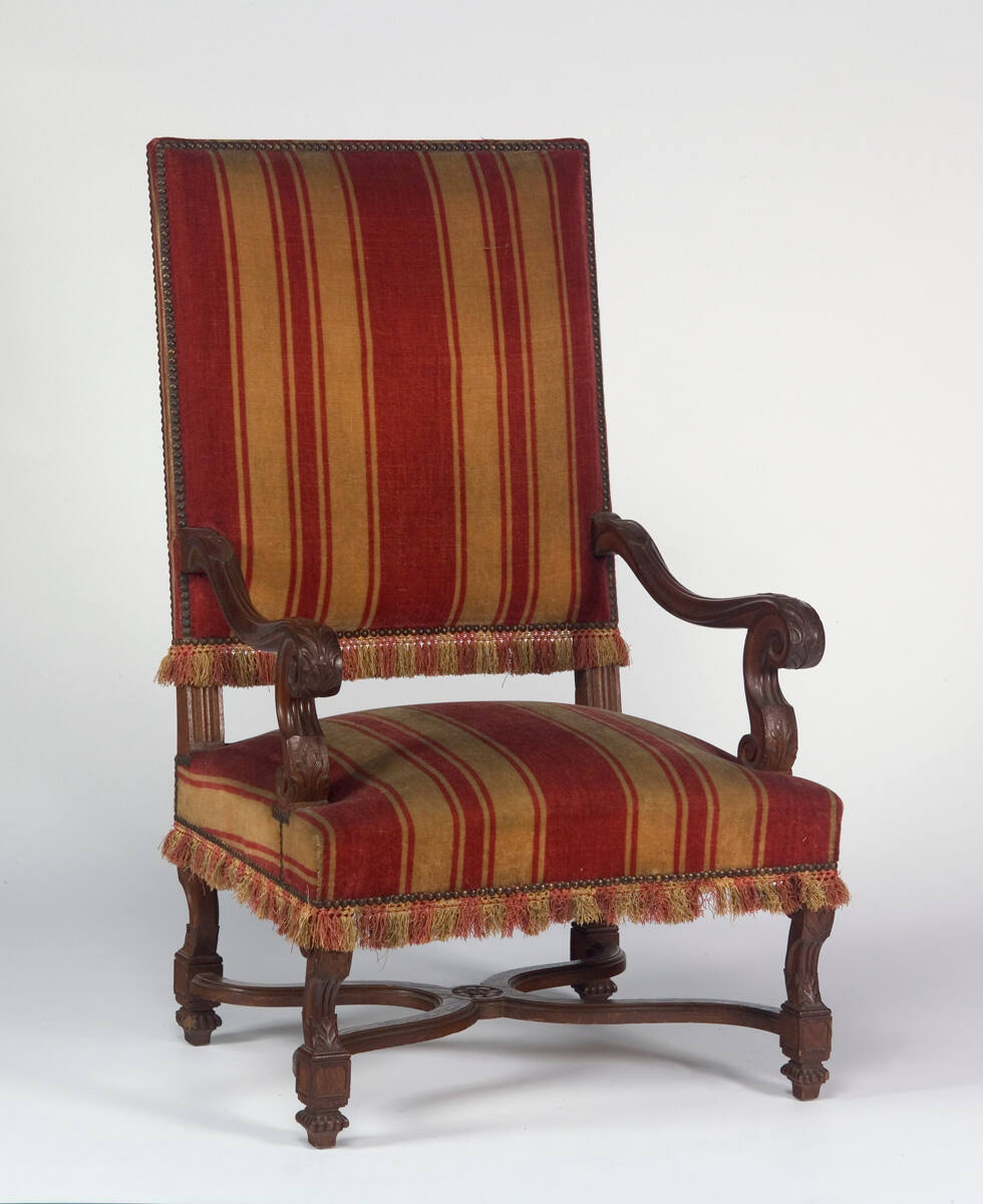 DescriptionHigh back arm chair. Carved walnut. Back and seat upholstered in red and gold striped velvet, trimmed with fringe and brass nails.ProvenanceProbably William Rockhill Nelson (1841-1915), Oak Hall, Kansas City, MO, by 1915 [1];