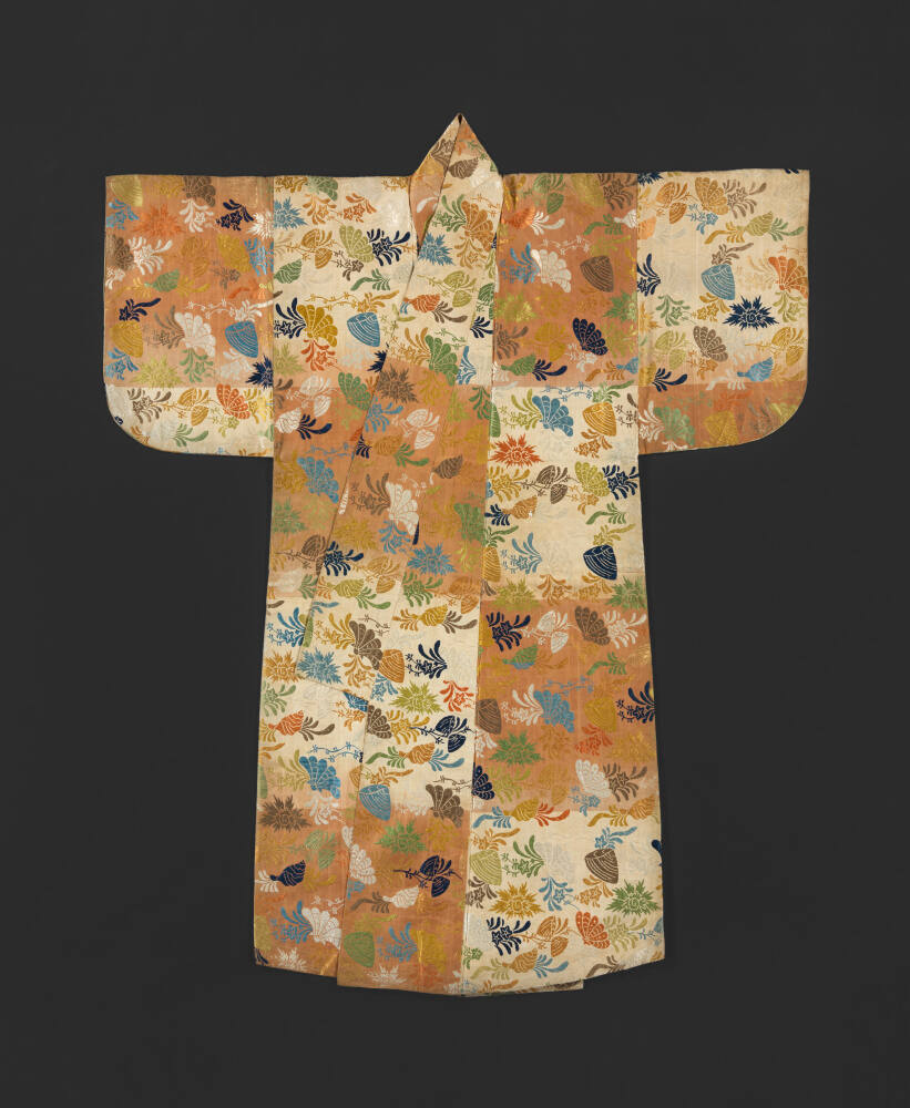DescriptionNō robe (Karaori type) with a design of seaweed and shells, such as clams, scallops, turban shells, and conch.Gallery LabelAs time passes, the environment blooms and withers away. The Buddhist concept of impermanence reminds us that life is ever-changing. Japanese Nō theater incorporated this idea in both plays on stage and the costumes actors wore. Here, shells and seaweed come together to evoke a tranquil beach scene. Chrysanthemum flowers scattered across the purple robe symbolize longevity, or long life.