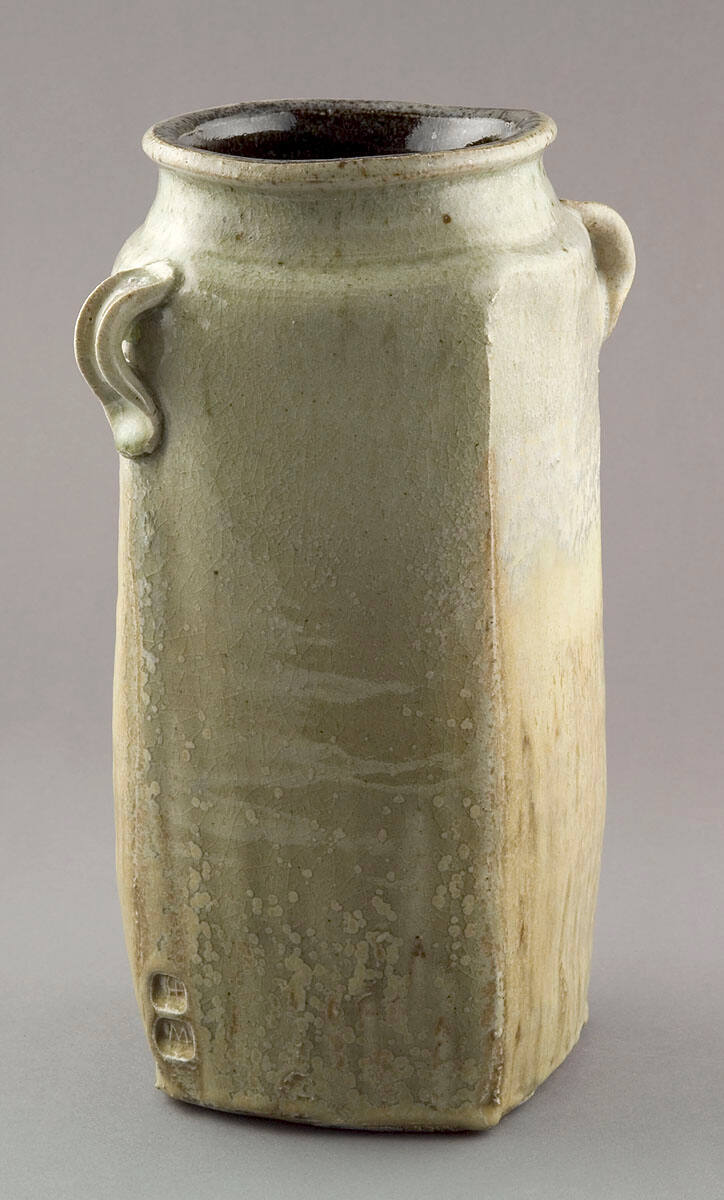 DescriptionVertical, rectangular vase with rounded corners, narrowed at top to a round rim. top on opposite corners. green/yellow mottled glaze with some crackle.Copyright© Estate of Warren MacKenzie