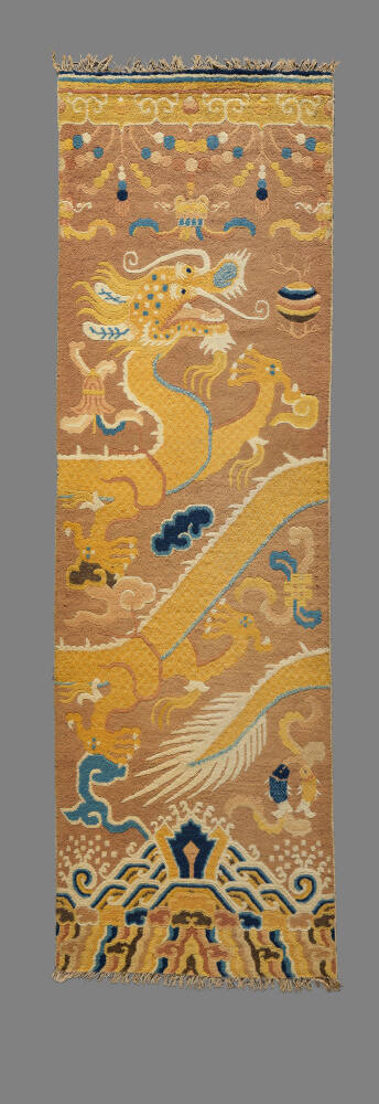 DescriptionRug decorated with a dragon in shades of yellow, brown, blue and white, amid a backdrop of conventionalized flowers on a light brown background.Gallery Label