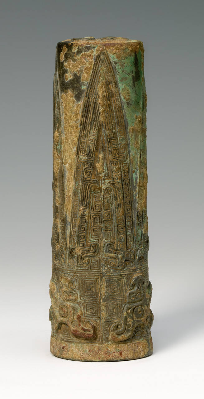 DescriptionTubular shaped pole end with one end closed, covered with incised formal pattern of "Chou hooks," dragons, coiled dragon on end; top has tao t'ieh mask in relief, two holes in sides for pins, green and red patina.ProvenanceT'ang Hsiao Wu, Peiping (modern-day Beijing), China, by March 30, 1934;