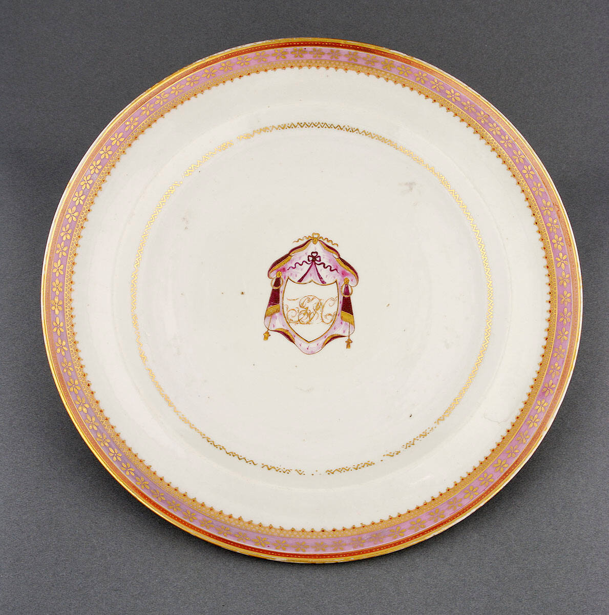 DescriptionNarrow borders in pink, red, and gold. Initials G.P.C. within shield.