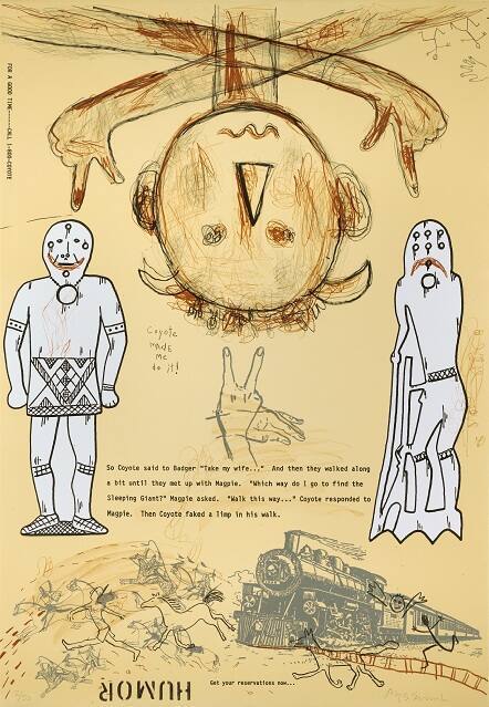 Gallery LabelJaune Quick-to-See Smith’s distinctive collage-based style merges found and drawn images. In these works, she details values she believes have imbued Native American people with resilience: nature/medicine, tribe/community, wisdom/knowledge, and humor. With lithographs like Survival Suite, Smith shared that she is “telling stories about hope with humor. We wouldn’t be here if we didn’t have hope.”