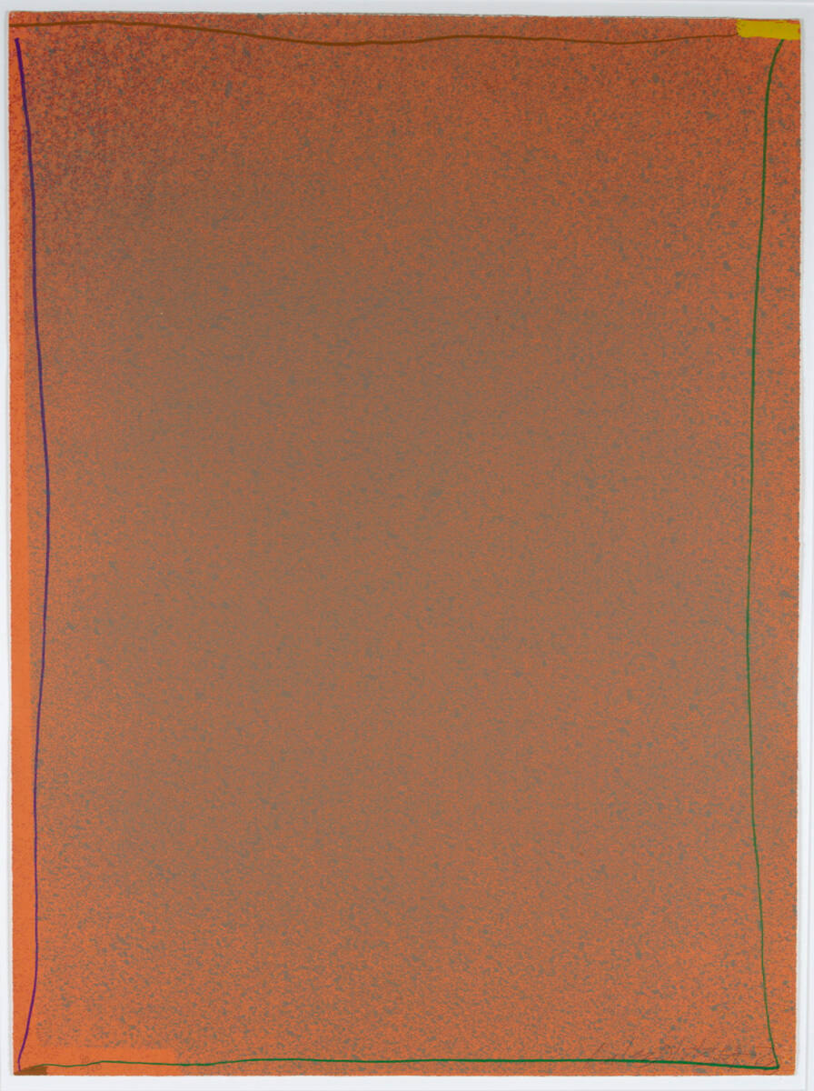 DescriptionAll-over pattern of green and dark red spots on orange ground, the density greatest at center. Yellow rectangle, top right. Single freehand wavering line on each side: green, bottom and right; blue, left; buff, top.Copyright© Estate of Jules Olitski / Licensed by VAGA at Artists Rights Society (ARS), New York
