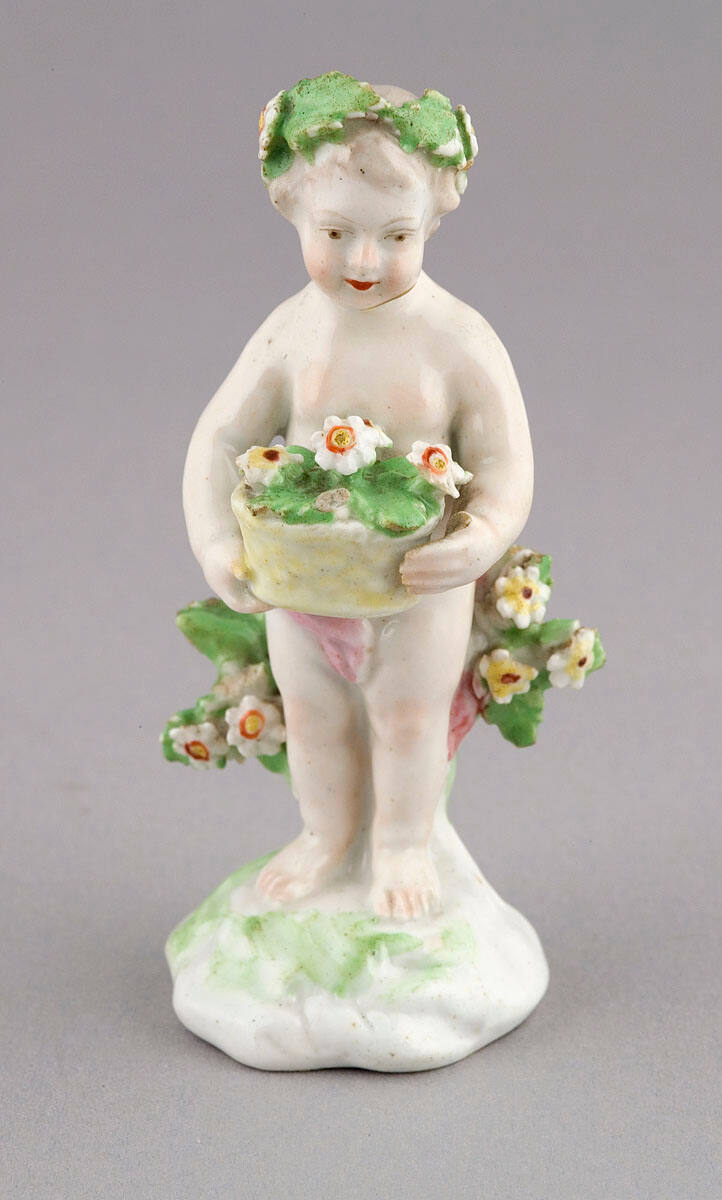 DescriptionThe nude boy stands on a mound-like base and is supported at the back by a small bocage. He wears a barland of flowers and leaves on his head, and holds in both hands a basket of flowers. A small light purple robe partly covers the figure.