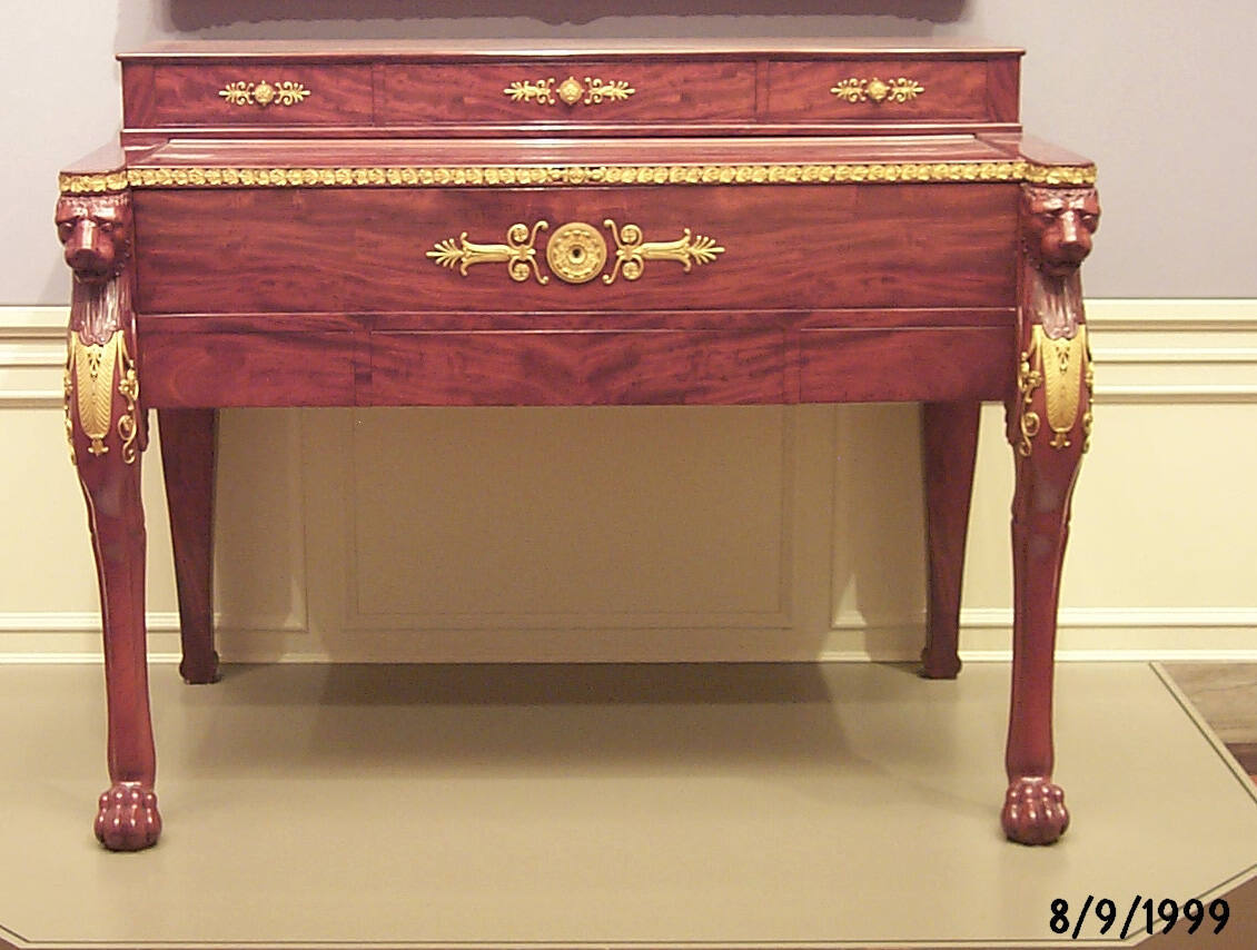 DescriptionThe upper part fitted with three drawers. The top of the lower part with a hinged fall front, sliding back to reveal a leather-covered writing surface and two drawers. Three drawers underneath. The front supports in the shape of winged lions and ending in claw feet. Mounted with bronze doré acanthus-leaf border, floral and ornamental appliqués and handles. A special mechanism locks all drawers when the dest is closed.ProvenancePrince Adam Karol Czartoryski (b. 1940), Hôtel Lambert, Paris, by 1975 [1];